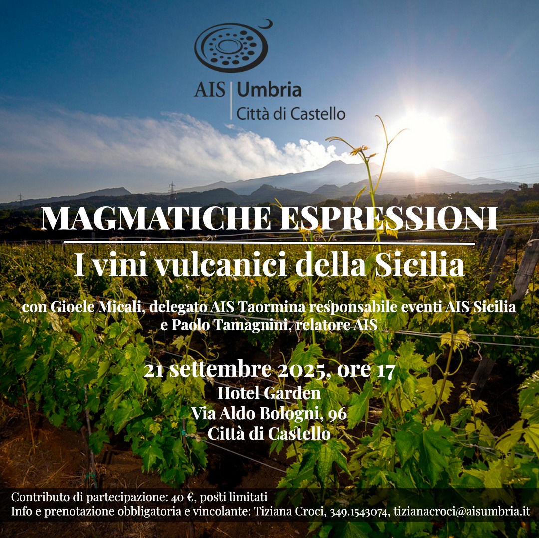 C’è un’anima che arde sotto la terra di Sicilia, terra di fuoco e di mare, che si prepara ad offrire un evento imperdibile dedicato a uno dei suoi patrimoni enologici più affascinanti: i vini vulcanici. Nati da terreni forgiati da eruzioni millenarie e intrisi di cenere, questi vini saranno i protagonisti dell’evento “MAGMATICHE ESPRESSIONI. I vini vulcanici della Sicilia”, organizzato dalla delegazione umbra AIS Città di Castello.